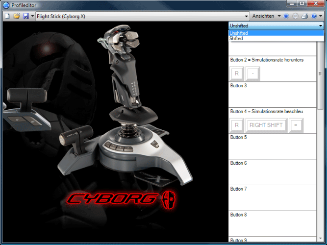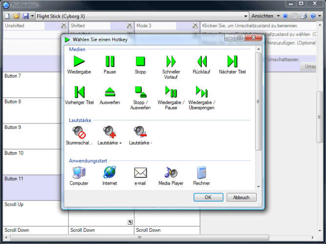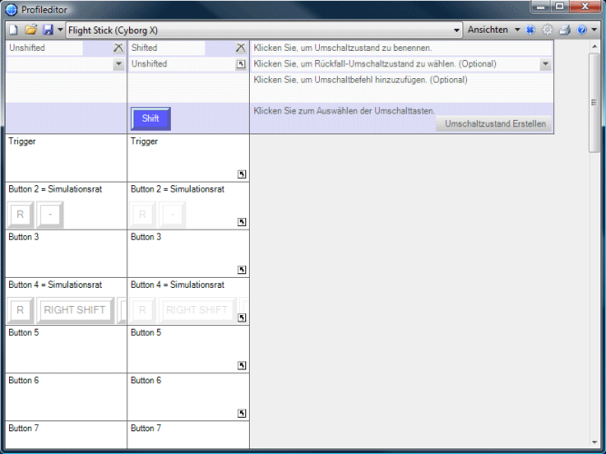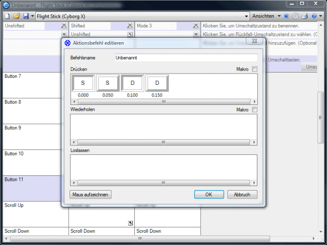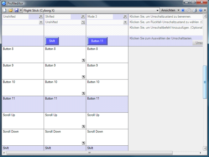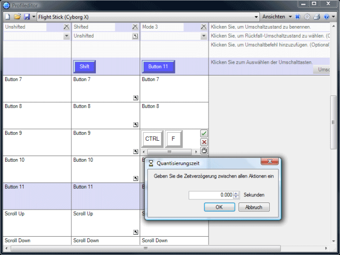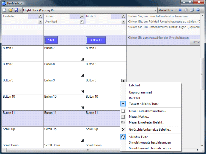 Eine weitere Funktion von Umschaltmodi ist die Fähigkeit, eine Tastenkombination zu programmieren, die beim Wechsel in einen Umschaltmodus ausgelöst wird. In manchen Flugsimulationen werden zum Beispiel verschiedene Gefechtsszenarien (Luft-Luft, Luft-Boden usw.) durch Drücken verschiedener Tasten auf der Tastatur aktiviert. Sie können nun so programmieren, dass dieses Szenario mit einem anderen Umschaltmodus Ihres Controllers und den spezifischen Funktionen der in diesem Umschaltmodus programmierten Tasten verbunden wird.