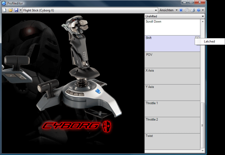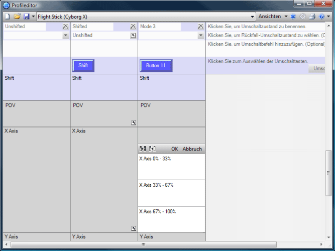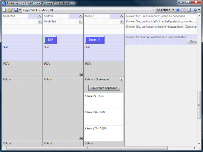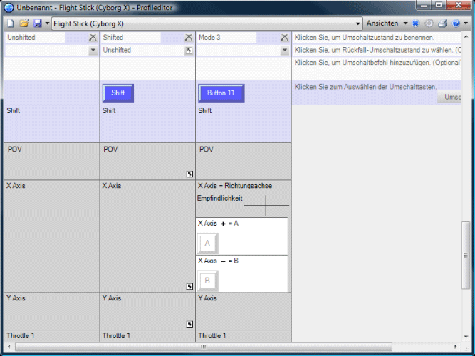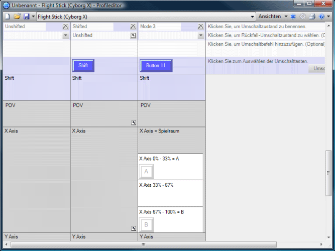 Falls Ihr Controller über „Modes“ (Modi) verfügt, behandelt der Profileditor diese als Umschaltmodi (z. B. X45, X52, X52 Pro, Aviator, Pro Gamer Command Unit, Gamepads).