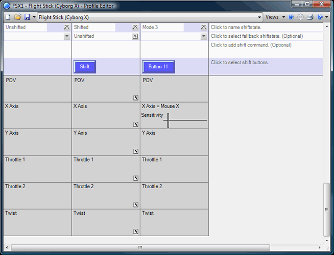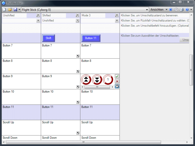 Klicken Sie nun erneut auf Create Shiftstate (Umschaltmodus erstellen), und Sie werden eine neue Spalte mit Zellen für diesen Umschaltmodus sehen. Damit wurde eine neue Spalte für die Steuerelemente erstellt, die in Modus 3 erzeugt wurden.