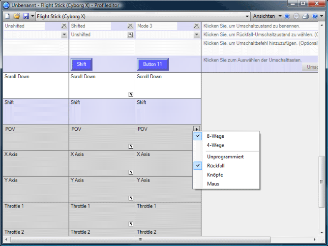 Wie bei den Tastenbefehlen können Sie „Unprogrammed“ (unprogrammiert) oder „Fall back“ (zurückschalten) auswählen. Sie haben auch die Option, dass der POV entweder als Anordnung programmierbarer Tasten fungiert (deren Anzahl durch Auswahl von „8 way“ (8-Wege) oder „4 way“ (4-Wege) festgelegt wird), oder aber als Maus.